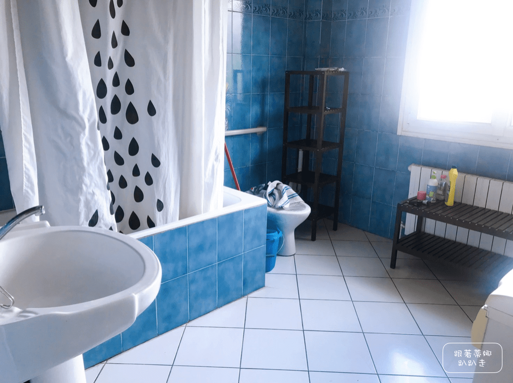 很大的浴室,一層樓有一間。這裡有洗衣機,也是另一個很適合背包客來住的原因之一。在歐洲浴室許多蓮蓬頭都是固定在屋頂上的,蒂娜個人比較不習慣,這裡的是像台灣可以手持的蓮蓬頭。